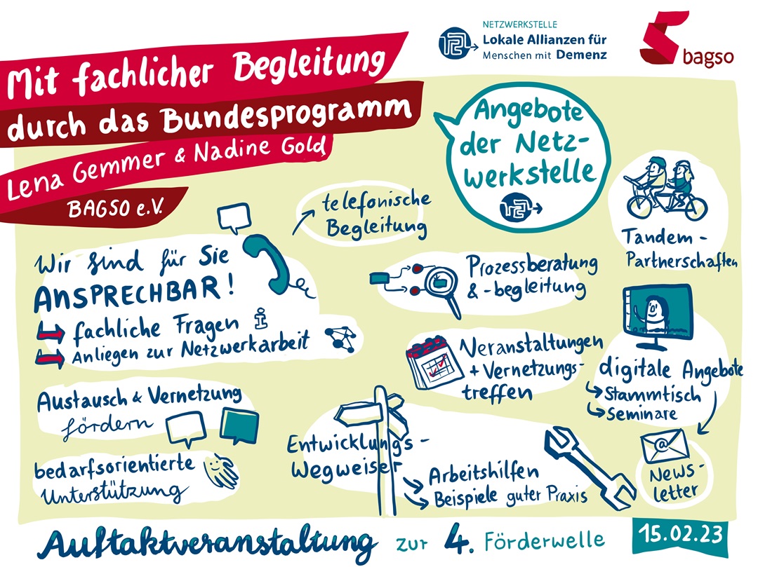 Unter diesem Motto hat die Netzwerkstelle die 2023 neu gestarteten Lokalen Allianzen des Bundesprogramms „Lokale Allianzen für Menschen mit Demenz“ zum gemeinsamen Auftakt eingeladen.