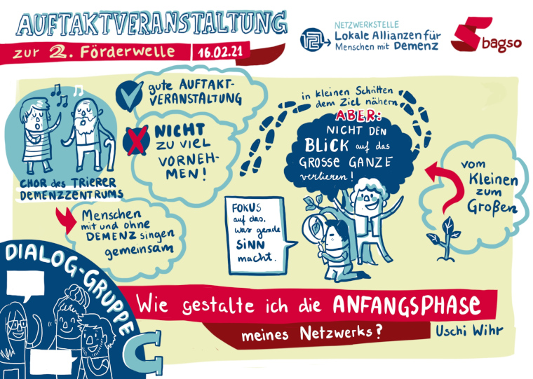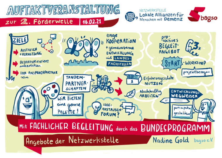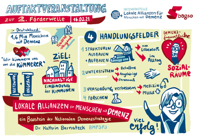 Auf Einladung der Netzwerkstelle hatten die geförderten Projekte Gelegenheit, sich mit den anderen Lokalen Allianzen sowie Partnern im Bundesprogramm auszutauschen und Impulse für die Netzwerkarbeit mitzunehmen. Die 29 Lokalen Allianzen der zweiten Förderwelle haben am 1. Januar 2021 ihre Arbeit aufgenommen, um lokale Strukturen aufzubauen, die Menschen mit Demenz und ihre Familien im Alltag unterstützen.